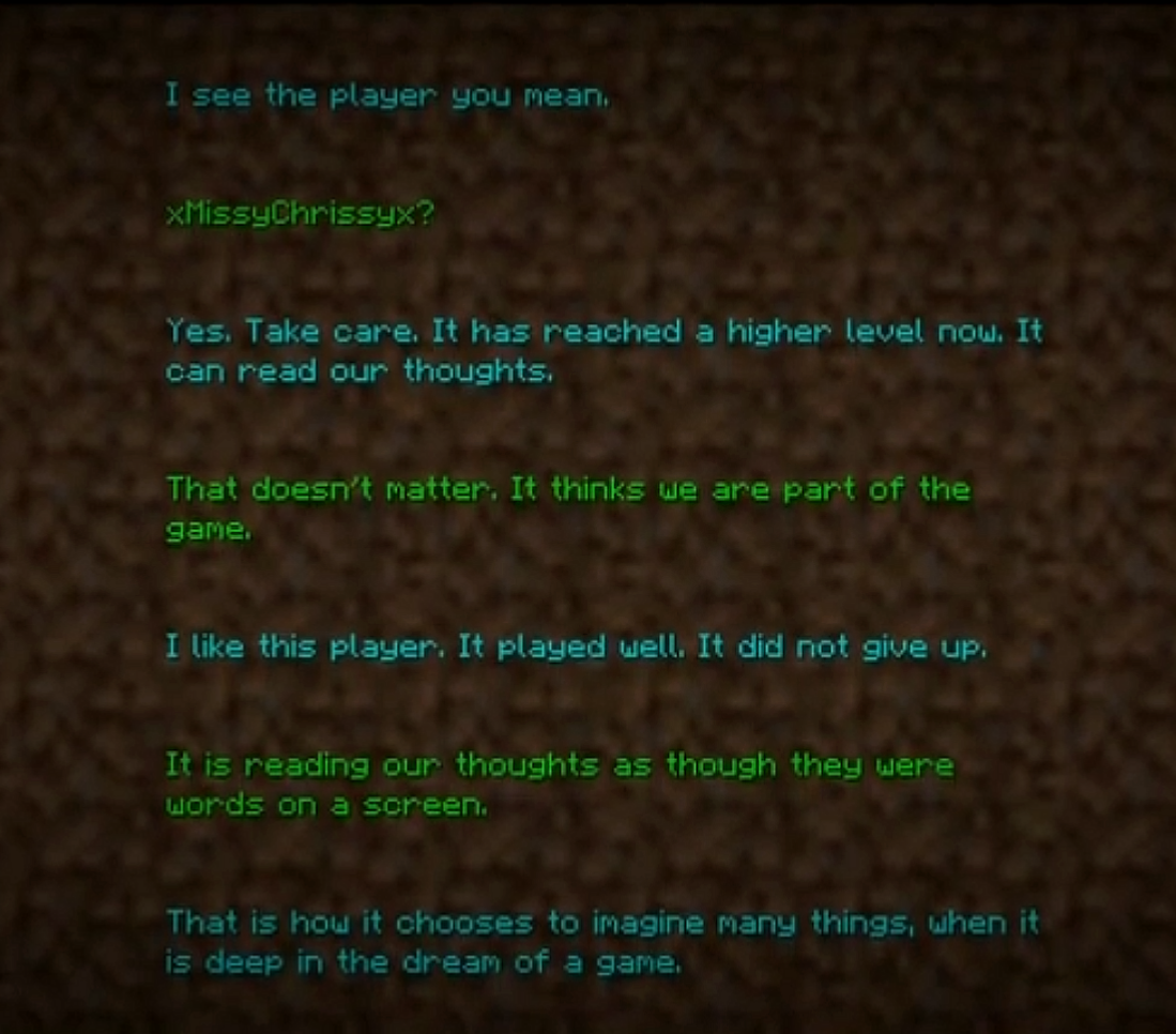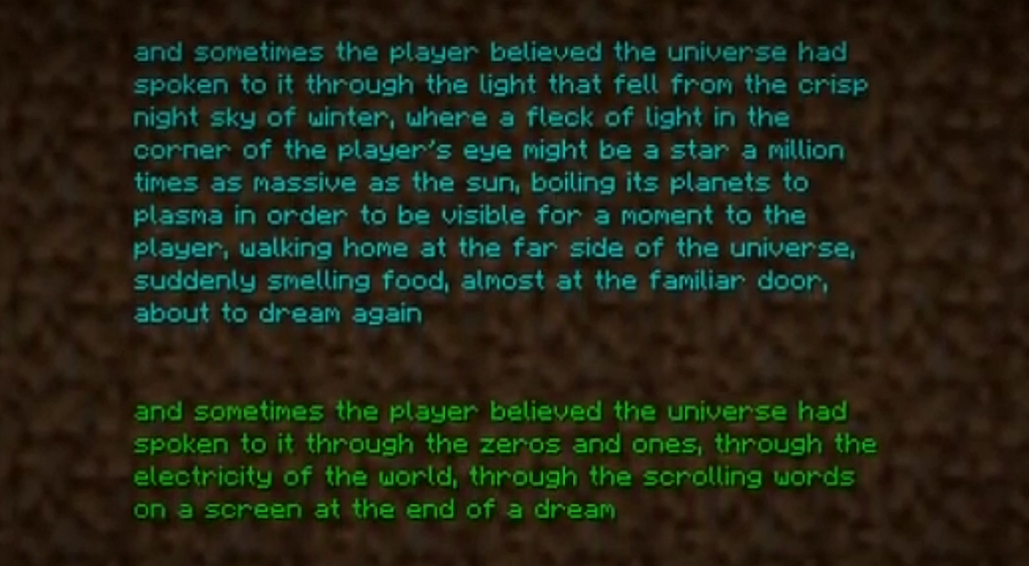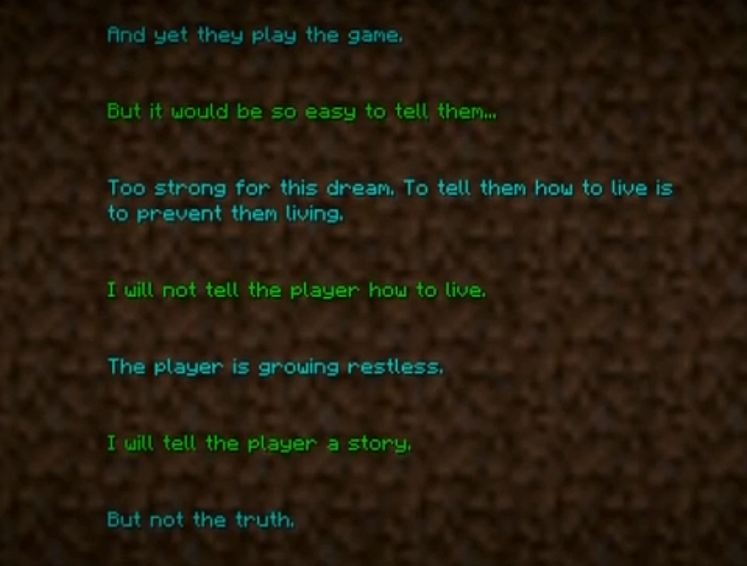 Arguably, the most glaring example of Minecraft’s dark side is revealed only after completing the game. In order to end the game, there is a pattern performed in which a player opens a portal to the dark and mysterious ender world. After passing through the portal, one fights the ender dragon. Upon defeating the dragon, the player unlocks an eight minute long story carefully concealed until after the player has invested hundreds and thousands of hours of game time.